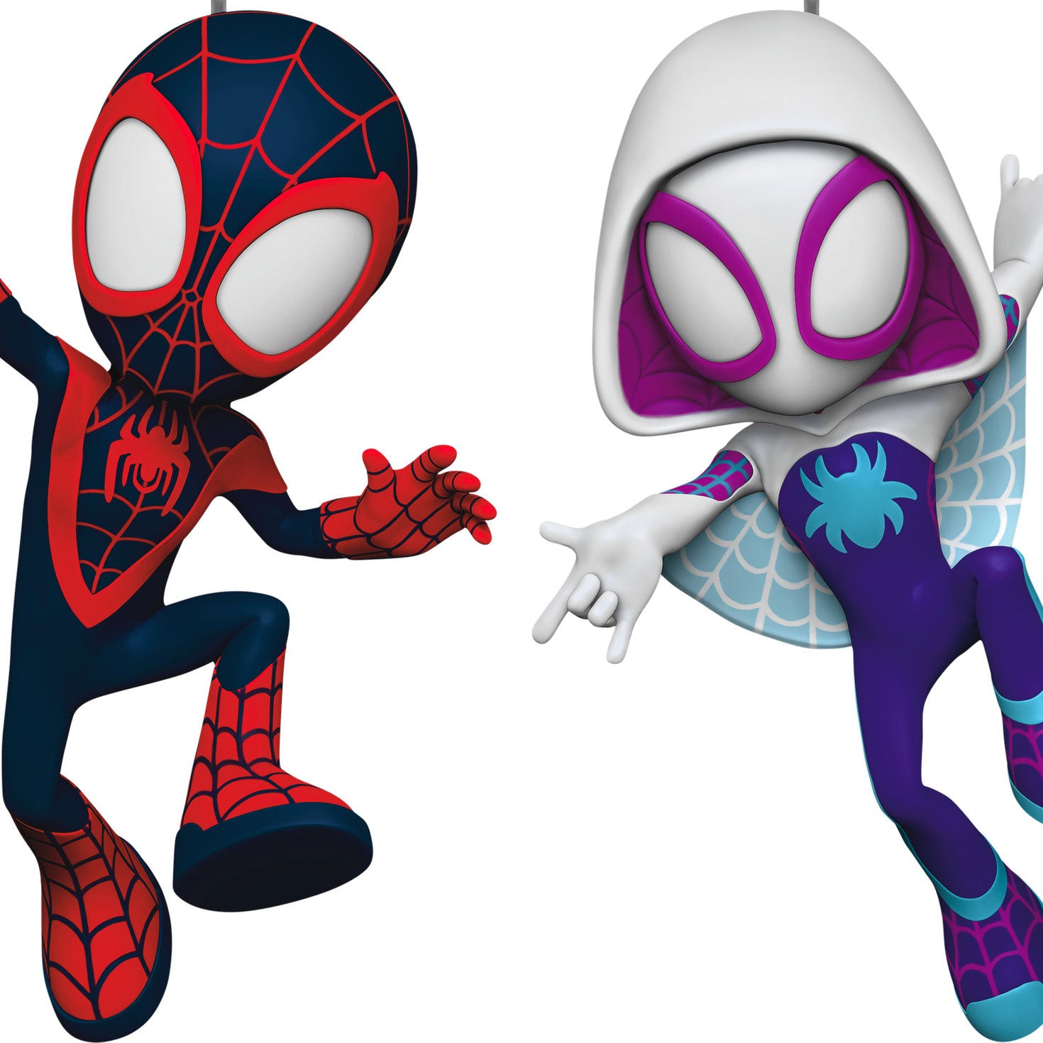During their daily lives as regular kids, Peter Parker, Miles Morales and Gwen Stacy share a strong friendship bond and a love of science and adventure. When they bring their super spider-powers to their crime-fighting adventures as Spidey, Spin and Ghost-Spider, they become the amazing Team Spidey! Fans of Marvel's animated series "Spidey and his Amazing Friends" will love to bring adventure to their holidays with this set of two Christmas tree ornaments featuring Spin and Ghost-Spider in their crimefighting costumes.