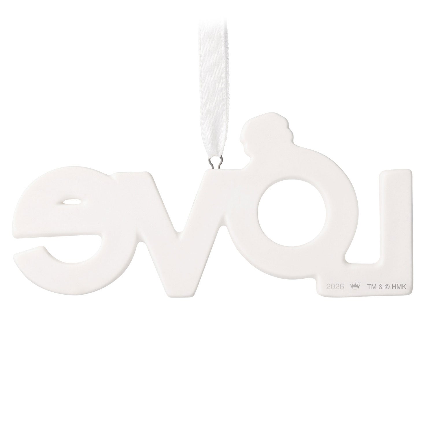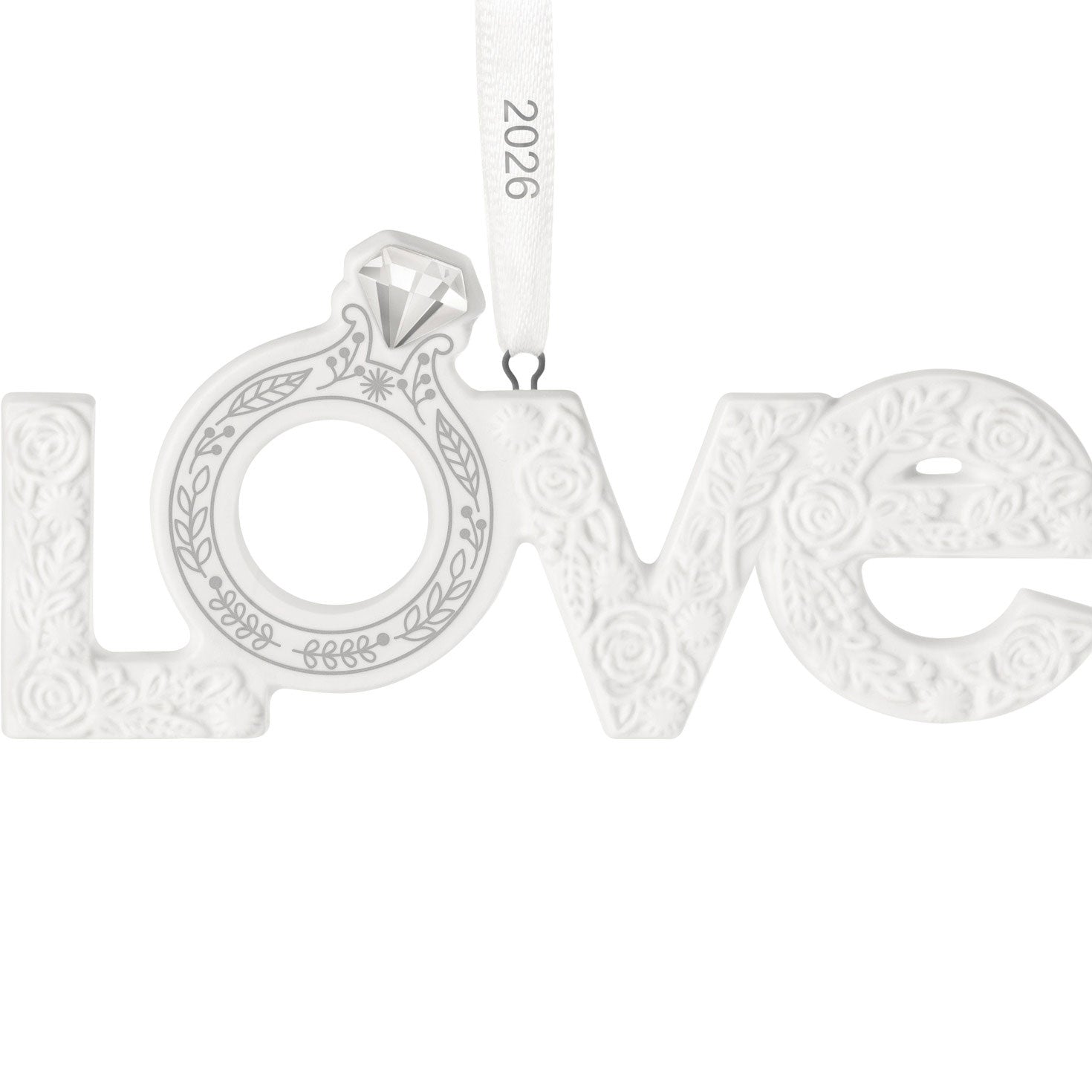 Commemorate a proposal and commitment with this elegant porcelain Christmas tree ornament. Perfect for celebrating the beginning of a beautiful journey together for a special couple, the "Love" word art design features a textured floral pattern with the "O" resembling an engagement ring with a silver leaf design and a sparkling diamond-shaped gemstone.