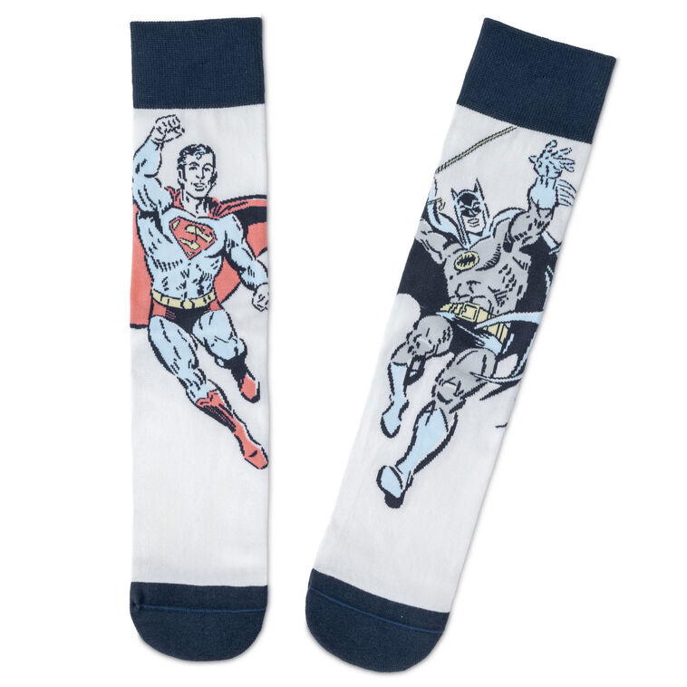 Whether you're saving the world (in your imagination) or just tackling your villainous to-do list, these Super Hero crew socks bring bold energy to your feet. Featuring iconic DC designs of Superman and Batman, this footwear will have you stepping confidently through errand-running down city streets or in meetings with coworkers in the Hall of Justice. The white socks are accented with dark blue heels, toes and cuffs, while stitched illustrations capture the legendary crime fighters in action.
