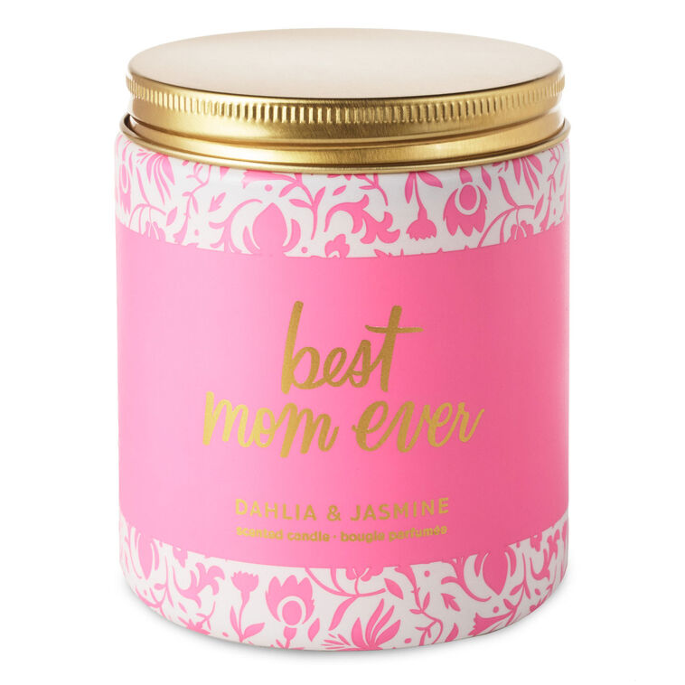 Warm mom's heart with this "Best mom ever" floral-scented candle in a lidded jam jar. The beautiful glass jar with a pink and white floral design features a lovely pairing of dahlia and jasmine fragrances. The single-wick candle with a gold screw-top lid includes a complimentary message detailed in gold foil on the label front and additional words of love on the back in small print. It makes a great gift for a first Mother's Day, mom's birthday or just because she's the best ever.
