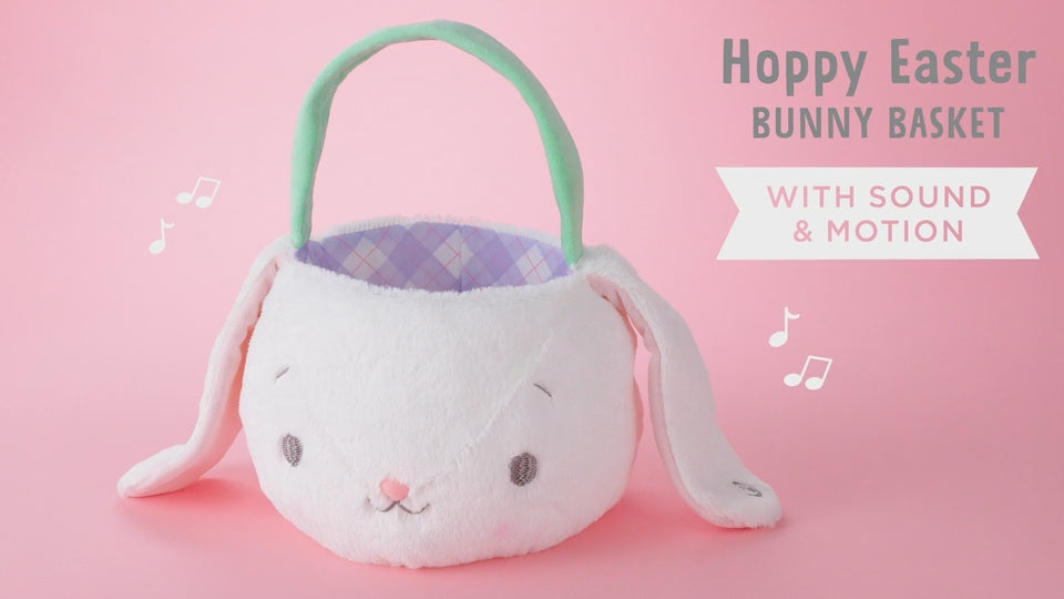 Make Easter egg-stra fun with this special bunny Easter basket with sound and motion. Press a button on the bunny's ear to hear a fun Easter parody of "A Tisket, A Tasket" and squeeze the bunny's tail at the back of basket to make its ears flop! This plush basket is perfect for collecting eggs or holding Easter goodies.